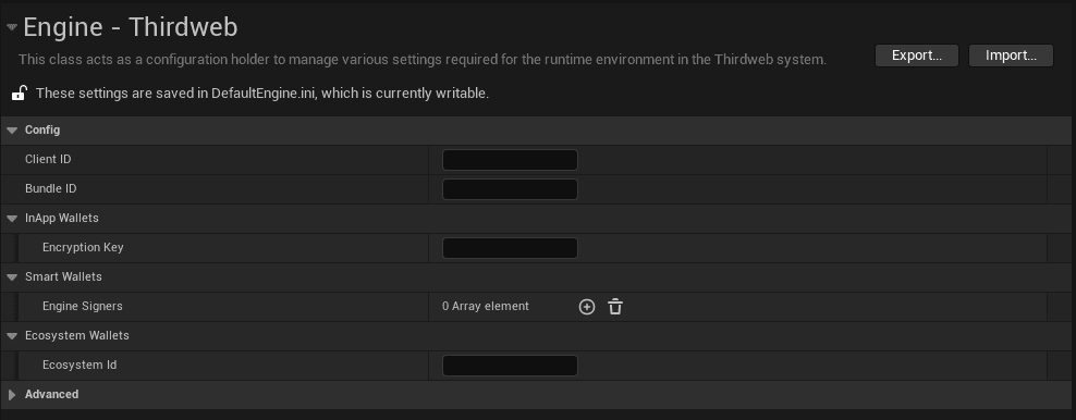 You can do so by clicking the thirdweb icon on your engine action bar, or by navigating to Edit > Project Settings > Engine > Thirdweb and filling in the required fields.